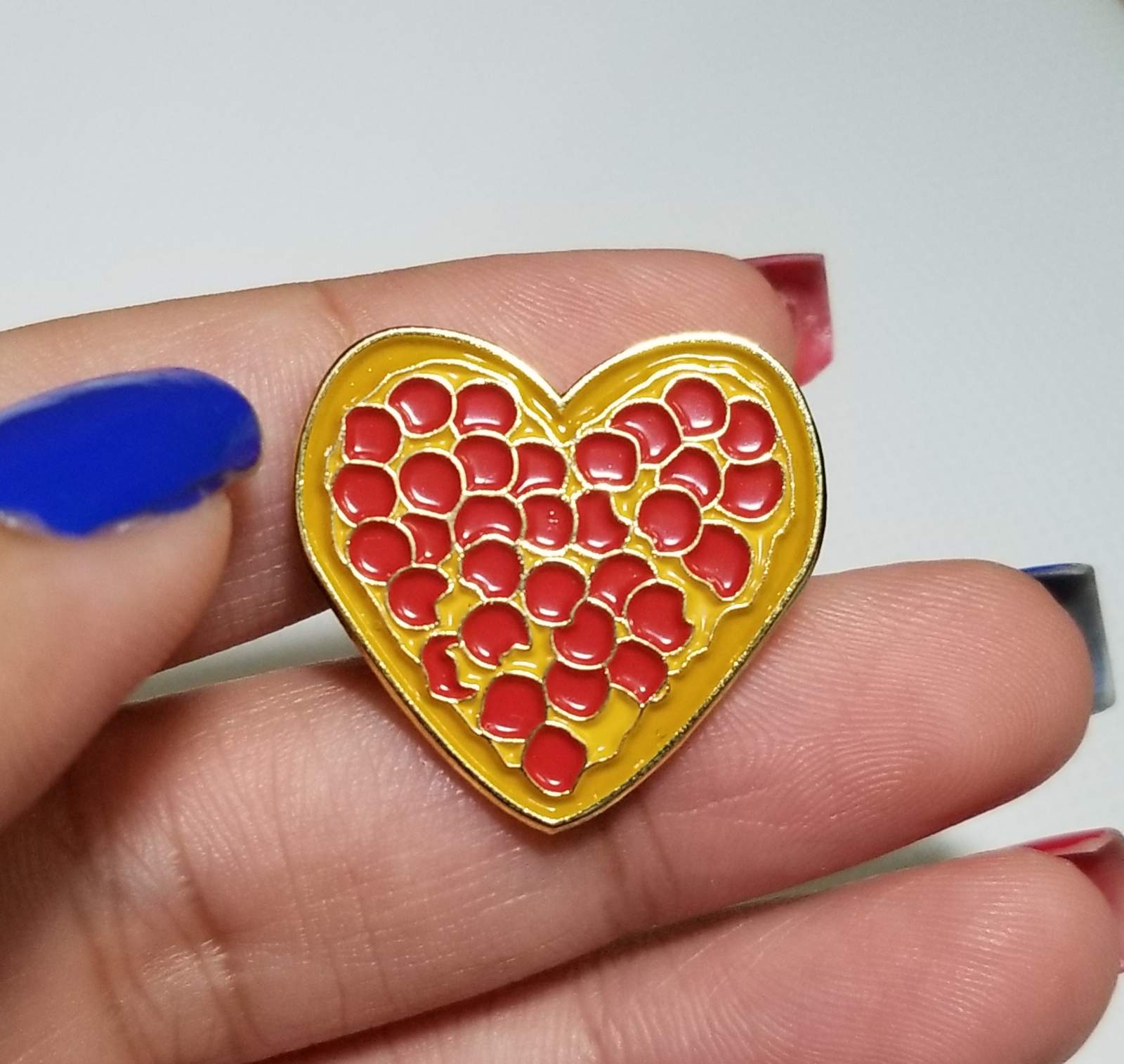 This pizza pin is in the shape of a heart and has pepperonis as a topping. This pin is for you if you love pizza and love to collect pins. 1inch x 1inch